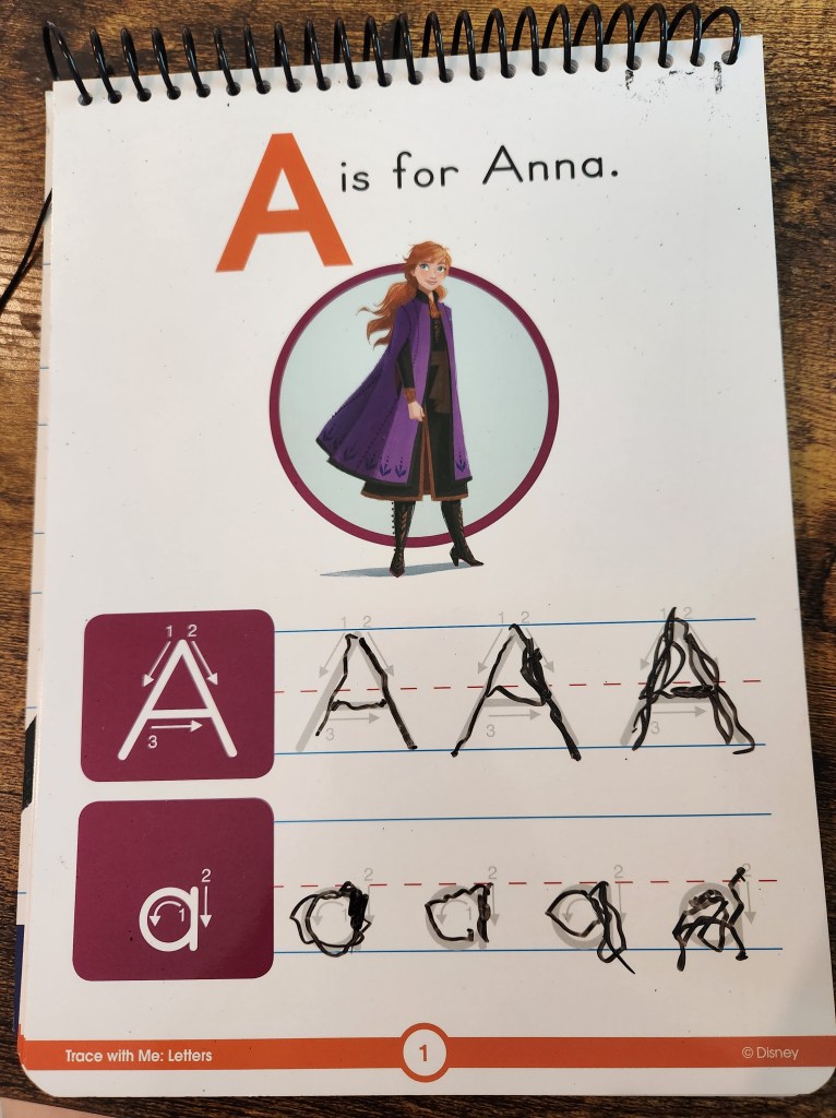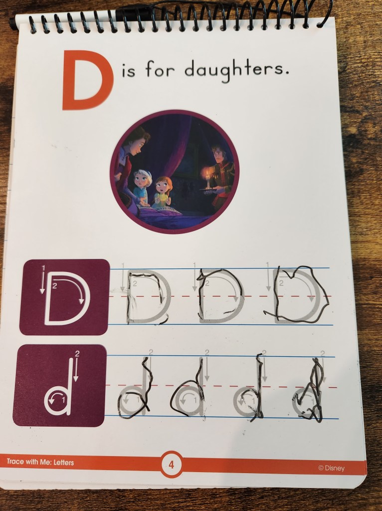 Today I decided to try to start a little structured learning with Isabella. I just wanted to do something constructive that did not involve a screen. I only planned on spending a few minutes, because I know they only have 10 to 15 minutes of attention in them at this age. I have some write and wipe Disney Learning books I got off of Amazon and I wanted to work on writing letters. Both my children have very strong personalities and at this point in their lives have had no structure or rules at all. They know there are certain things they absolutely cannot do, but overall they basically run wild all day.