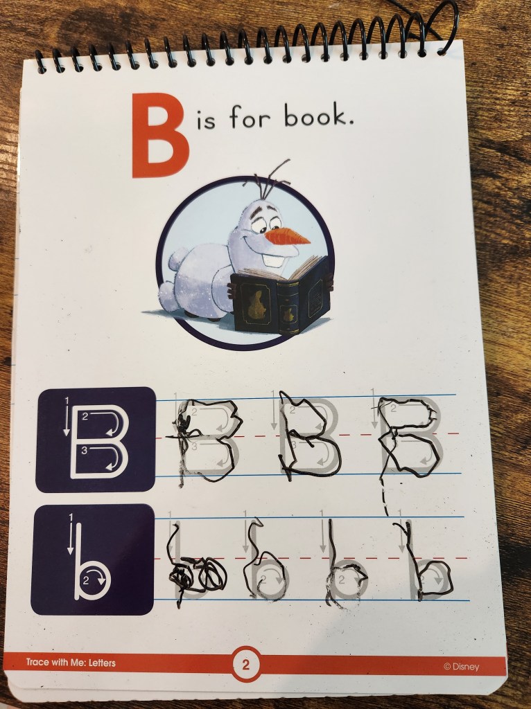 Next was “B is for book.” This came with the argument that B is not for Olaf and there is in fact a B in Isabella, even though she has mastered I is for Isabella. Yes, Olaf is on the page, but he is reading a book. Olaf starts with O. Pay attention to the numbers. Did you just scribble? What are you doing? Look! That’s much better!