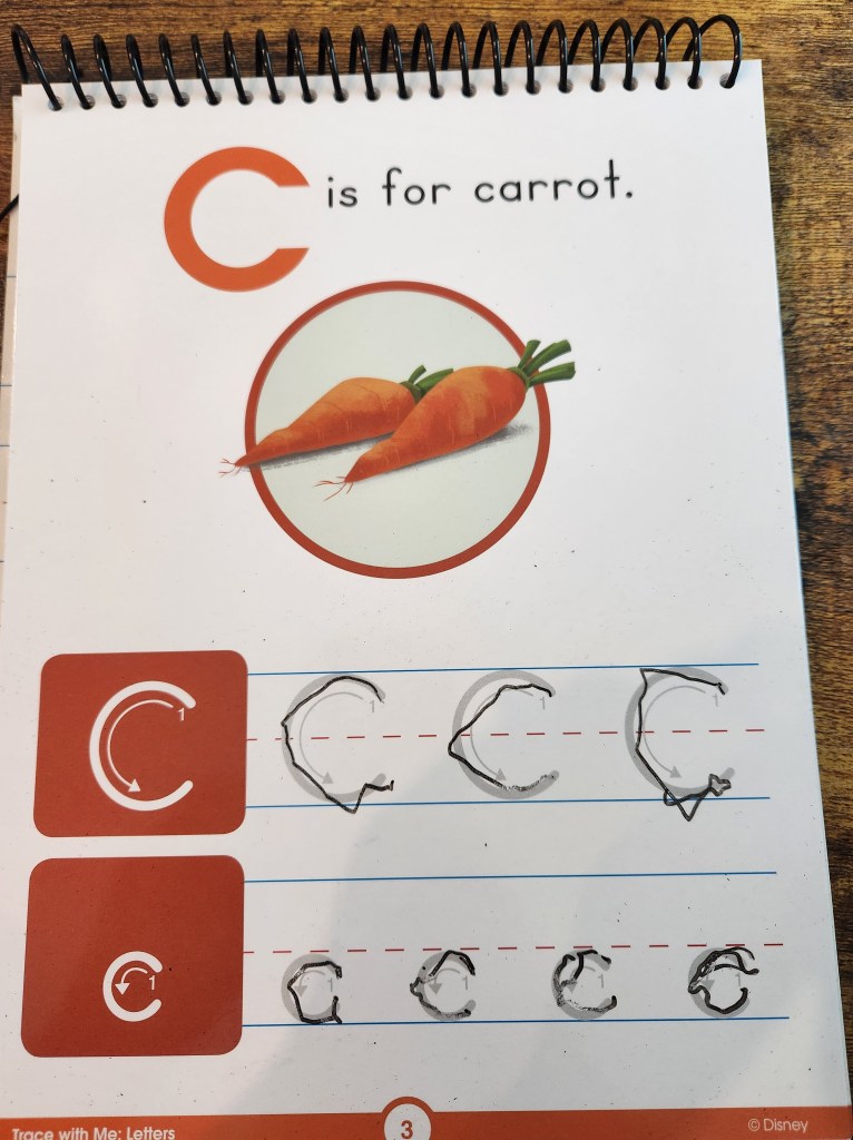 Next up, “C is for carrot.” It’s like a circle! Almost baby girl, except that it’s not quite complete, see? It stops. You did really good on that one!